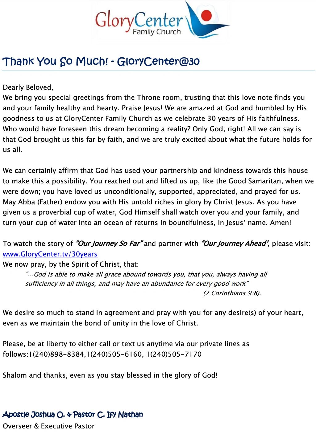 Read the heartfelt thank you message from our pastors and click below to see all the actions from our 30th Church Anniversary celebration weekend. It was power packed to the glory of God.